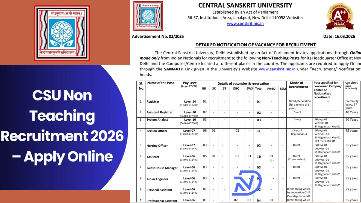 केन्द्रीय संस्कृत विश्वविद्यालय (Central Sanskrit University – CSU) ने गैर-शिक्षक पदों पर बंपर भर्ती का ऐलान किया है। सरकारी नौकरी की तलाश कर रहे युवाओं के लिए यह एक बेहतरीन अवसर है। CSU Non Teaching Recruitment 2026 के तहत विश्वविद्यालय के मुख्यालय (नई दिल्ली) तथा देशभर के विभिन्न कैंपस और केंद्रों में कुल 144 रिक्तियों पर नियुक्तियाँ की जाएंगी।